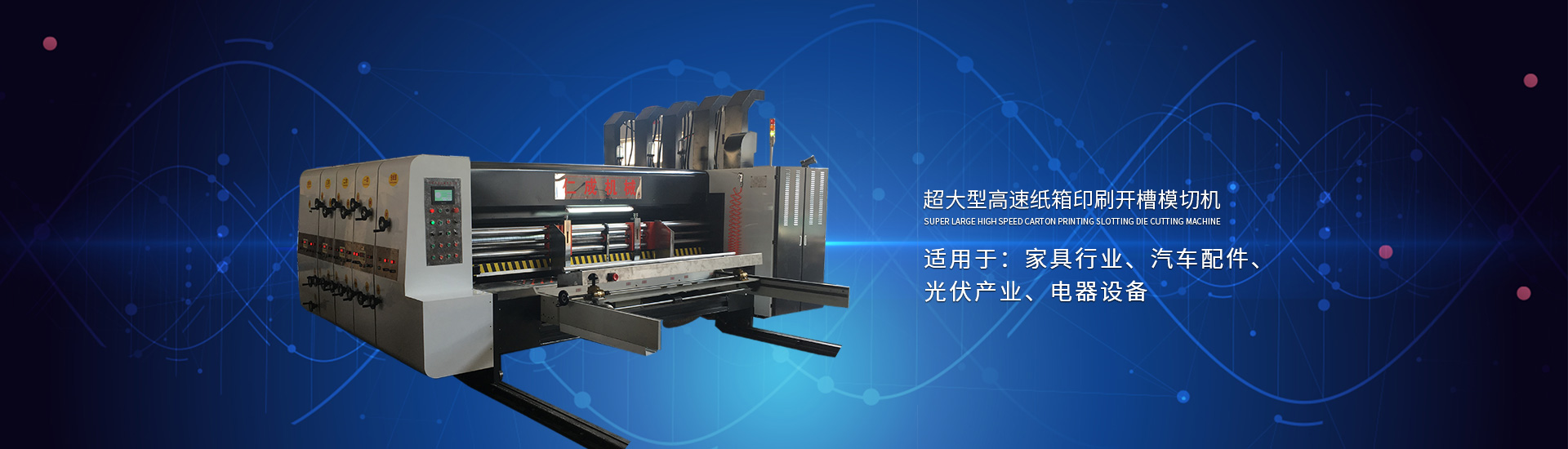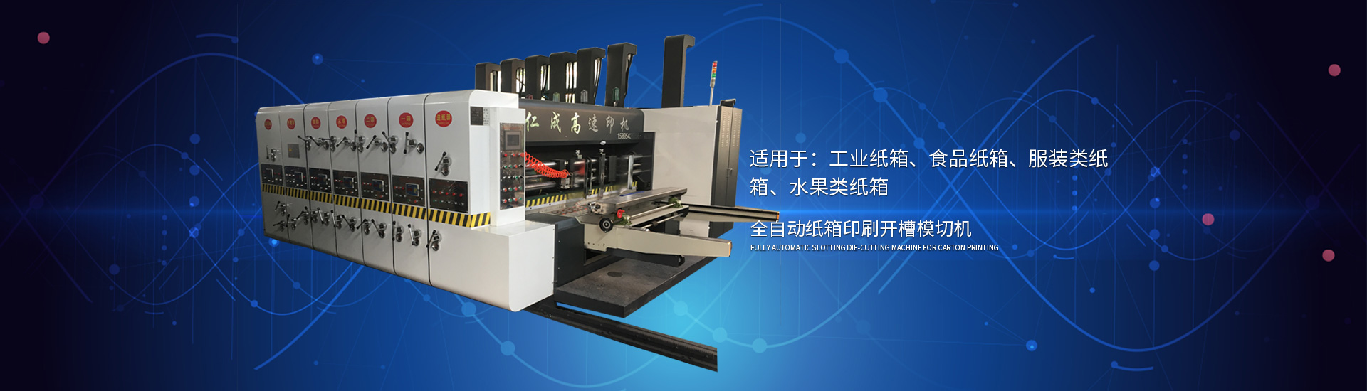 主要產品有高速印刷開槽模切機、半自動水墨印刷開槽模切機、全自動粘箱打包聯(lián)動線、全自動 插格機、半自動粘箱機、半自動釘箱機、手動釘箱機、薄刀分紙機、PE繩打包機、PP帶智能打包 機、圓壓圓模切機、平壓壓痕機、自動裱紙機、水墨污水處理機等產品